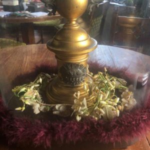 Kruisbeeld Bladgoud met zilveren ornamenten onder stolp